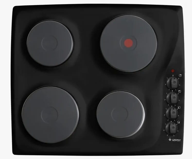 Gefest ЭС СВН 3210 К21 — независимая электрическая панель, которая встраивается в нишу 56,2х48,6 см. Устройство оснащено четырьмя чугунными конфорками разной мощности: 1,5 кВт, 2х1 кВт и 2 кВт. В них реализована технология быстрого нагрева. Блок управления с поворотными механическими переключателями размещен справа, есть световой индикатор включения. Поверхность сделана из эмалированного металла черного цвета, обладает обработанными краями без рамки. Потребляемая мощность прибора — 5500 Вт, подключается к электросети напряжением 220 В. Размеры варочной панели — 52х59 см, вес — 12 кг.